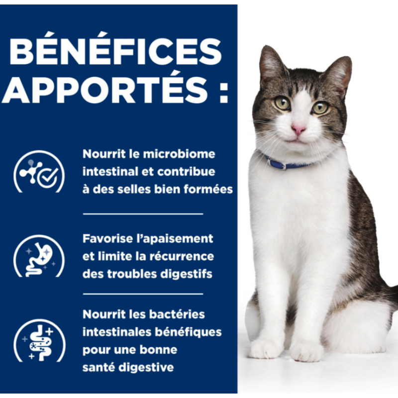 Hill's Prescription Diet Gastrointestinal Biome est cliniquement prouvé pour aider à prendre en charge les chats atteints de diarrhée ou de constipation en seulement 24 heures et pour réduire le stress.