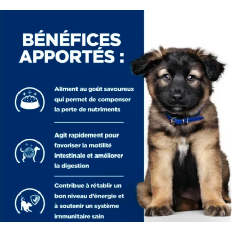Volledig dieetvoer, hoog verteerbaar, speciaal ontwikkeld om de opnameproblemen in de darmen te verminderen en de slechte spijsvertering en exocriene pancreasinsufficiëntie bij pups te compenseren. Dit voer bevat een hoog natrium- en kaliumgehalte en ingrediënten die makkelijk verteerbaar zijn.